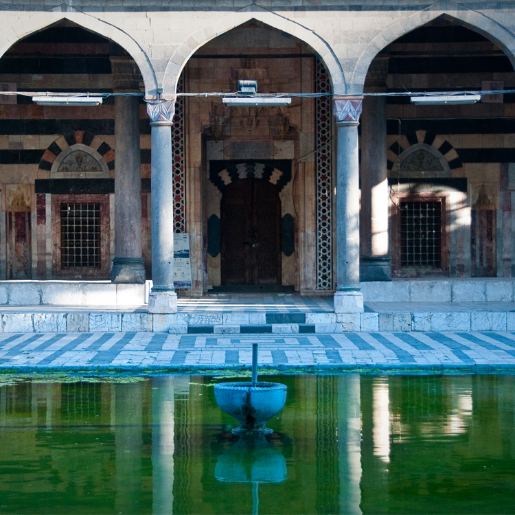 Located outside the city of Damascus at the time of its construction, the Tekkiye Süleymaniye was built to provide services for caravans making the Hajj, or pilgrimage to Mecca: here, in the countryside just west of Damascus, pilgrims could rest before continuing their long journey into the desert. The Tekkiye comprises a mosque and a range of public facilities including a soup kitchen, stables, and a small number of travellers’ lodgings likely intended for special guests making the Hajj. A madrasa and market were added to the complex in 1560 (967 AH) by Sultan Selim II. The Tekkiye is arranged around a courtyard and central ablution pool, and framed by the mosque to the south, rows of guest rooms to the east and west, and stables and soup kitchen to the north. The madrasa and market are located east of the main complex. Although comparatively small, the mosque is made to look larger through the addition of a portico, a typical feature of Sinan’s designs, echoed by the arcade surrounding the guest rooms and soup kitchen. The repeated motifs of domes and arcades create a sense of balance between the mosque and the subsidiary structures of the Tekkiye, consistent with the designs of Sinan’s mosque complexes in Istanbul.