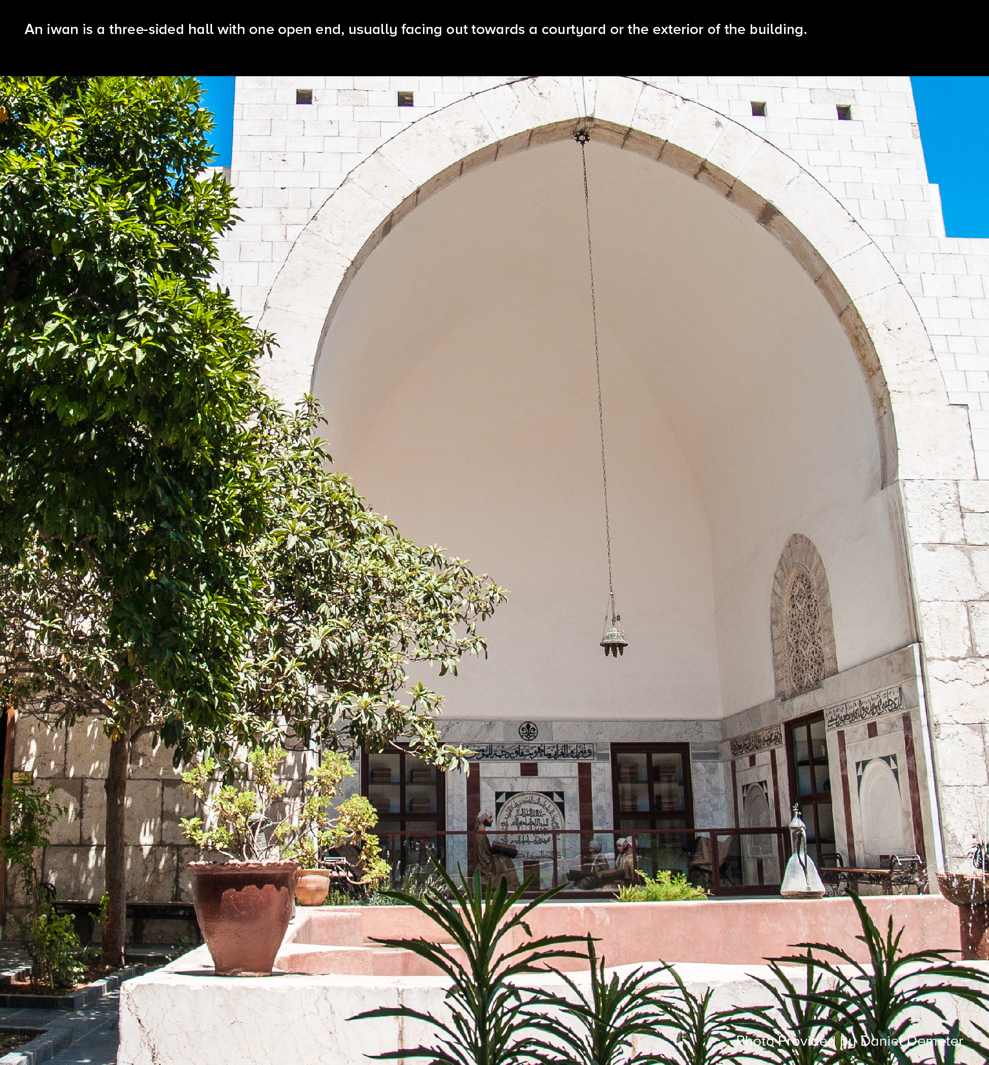 The layout of the bimaristan is based on the four-iwan cruciform plan. This plan, typical of Islamic architecture and used especially for mosques and madrasas, has uncertain origins (with its earliest surviving appearance possibly at Lashkari Bazar in Afghanistan, 998-1030/388-421 AH as suggested by André Godard).2 Its use at the Bimaristan Nur al-Din is the first use of the four iwan-plan in a hospital, and the first stone four-iwan construction in the Islamic world. Although the exact function of each of the iwans remains unclear, physician Ibn abi Usaybi‘a described the east iwan as a place for discussion between the head physician and his students after the day’s patients had been treated.3
